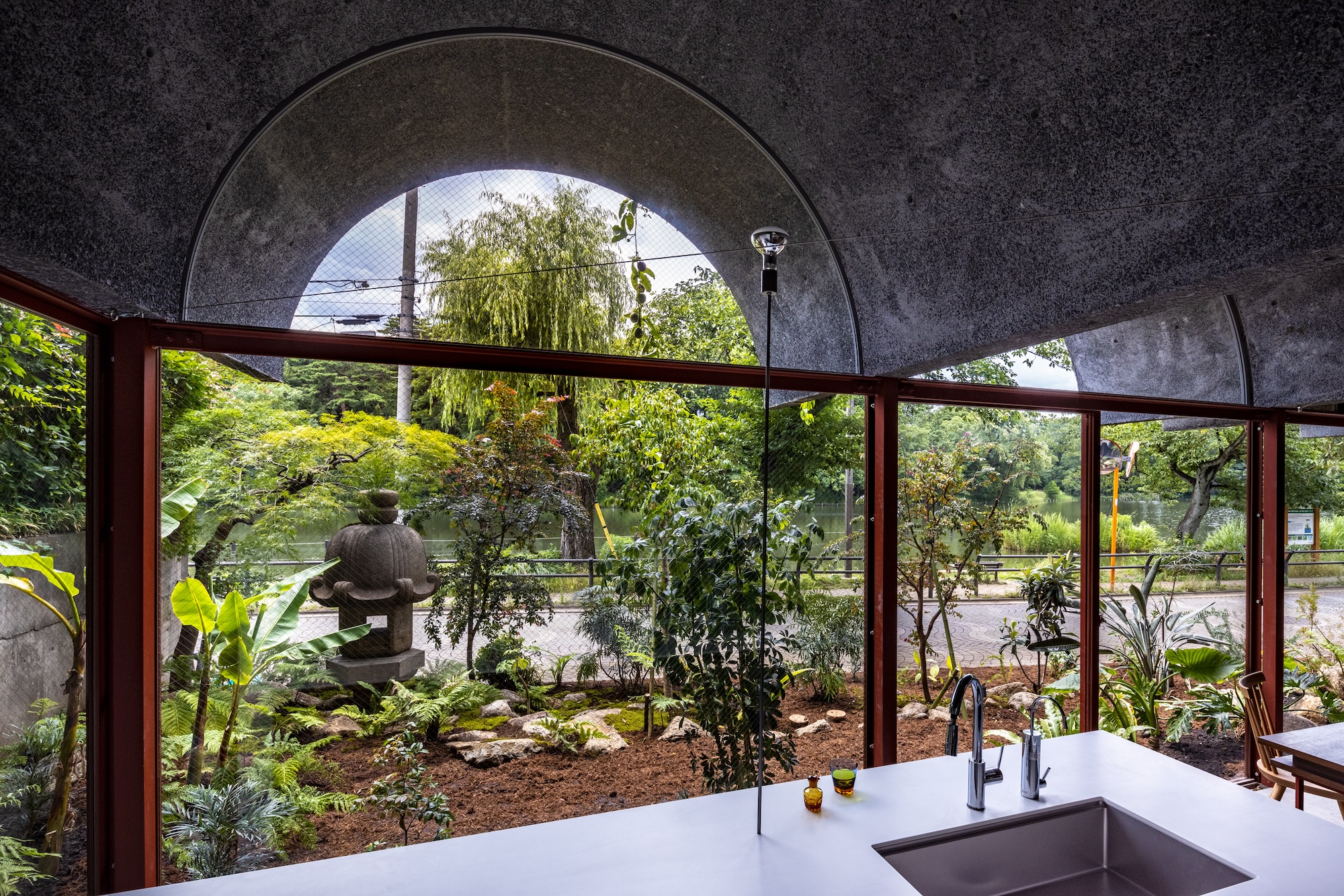ユニークなアーチを描く洗い出しのコンクリートと、建物全体を覆う多種多様な緑。東京都練馬区・石神井公園の池を望む〈鶴岡邸〉は、施主の鶴岡氏が住む家として建てられました。現在は設計を手掛けた武田清明さんが1階に事務所を構え、自然豊かな公園と住宅街の境界をゆるやかにする役割を担っています。全面ガラス張りの室内にはオレンジ色の陽光が差し込み、時にはカフェと勘違いしたご婦人が迷い込んでくることも。そんなほほえましい日常の生まれる建築が、都市の未来にもたらすものとは?建築家の武田清明さんにお話を伺いました。