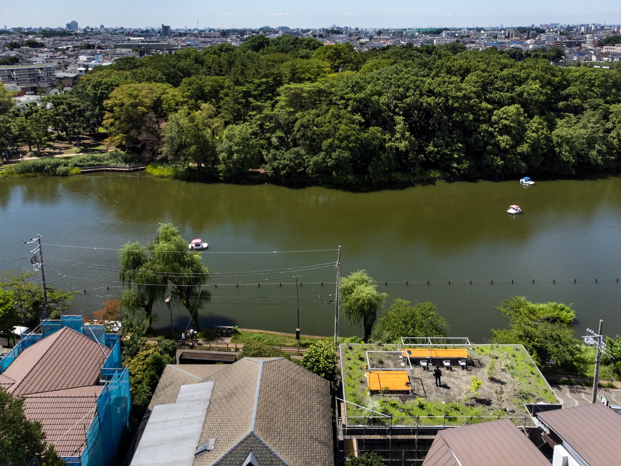 〈鶴岡邸〉は石神井公園の目の前に位置し、屋上からは公園の自然を一望できる。
