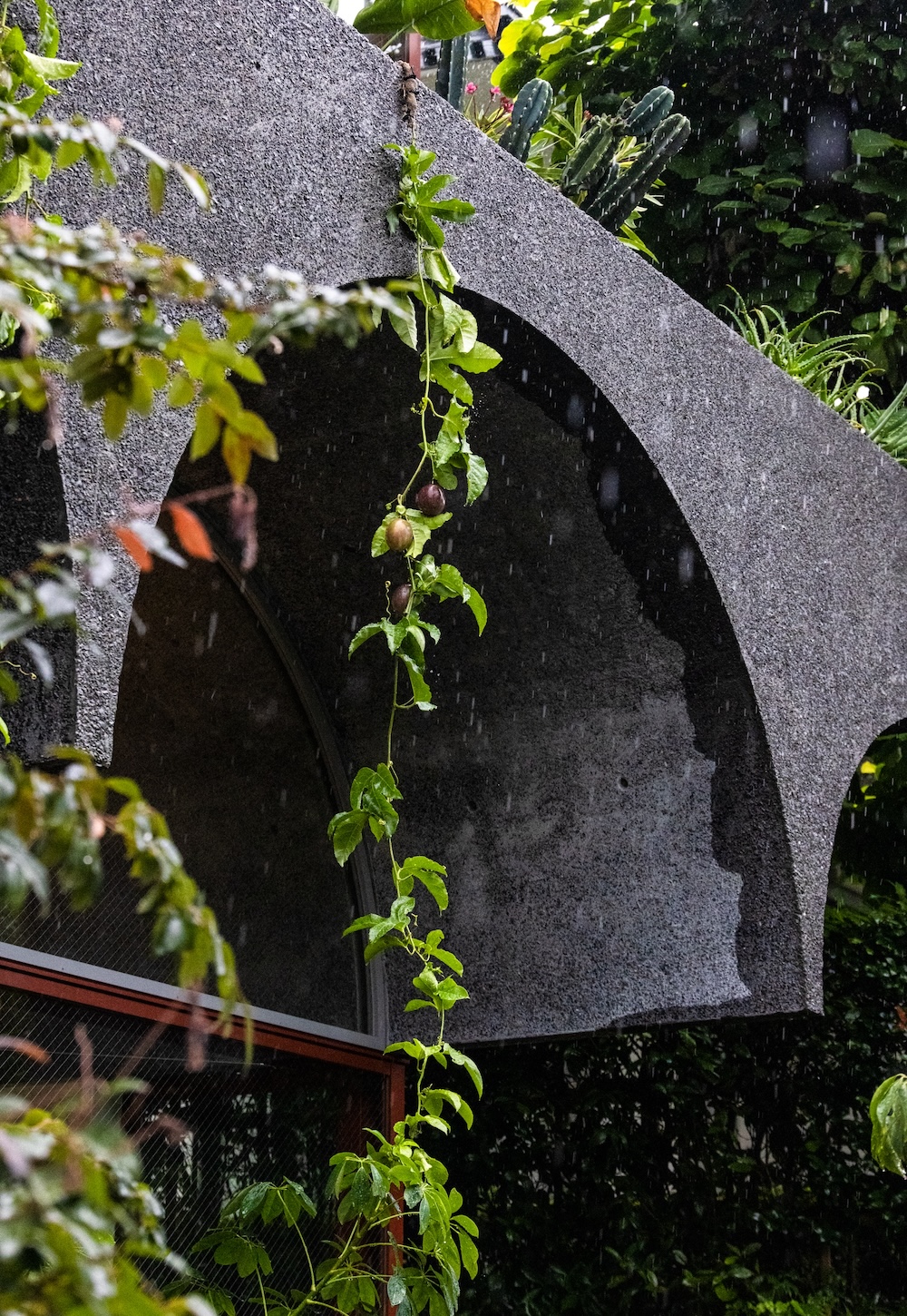 石神井公園は探鳥地としても知られる自然豊かな公園で、〈鶴岡邸〉はその公園と居住エリアのちょうど境目にあります。いい意味で中途半端な場所なので、普通だったら住宅街まで入ってこない鳥が飛んでくるようになりました。そしていろんな種を運んできて、敷地内に勝手に植物が生えていくんです。この偶発的な増殖が面白くて。「ちょっとここにフンしてよ」なんて鳥には通用しませんからね(笑)。また敷地内にはバナナやパッションフラワーなど公園にはない植物も生えていて、100種類以上がごちゃ混ぜに共存しています。その種をまた鳥が別のところに運べば、地域に新たな生態系が育まれるかもしれない。今後どうなっていくのか楽しみです。