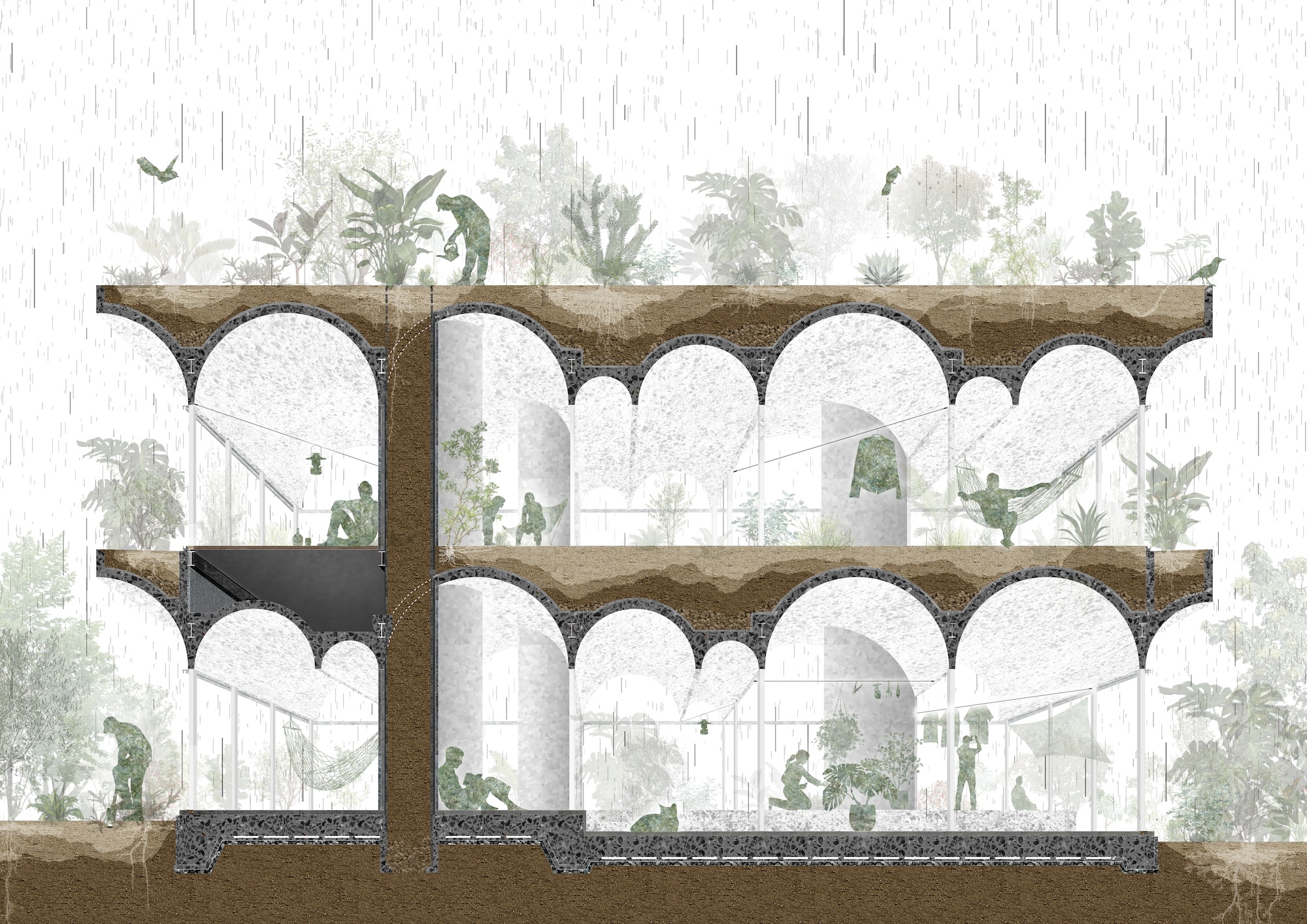 芝生を植えるだけの屋上緑化はよくありますが、鶴岡さんの望むような大きな樹木を屋上に植えるとなると、土の深さが60cmくらい必要です。すると問題になるのが荷重です。また雨がたくさん降った時にダメージが一極集中しないよう、水を分散して排出するシステムも必要です。そこで天井をフラットにするのではなく、ヴォールトという半円状のアーチ構造を連続させることにしました。山に降った雨は谷へと流れていきますよね。同じように、1階と2階の天井と柱に土を入れ、ヴォールトに沿って雨水が屋上から下に流れるようにして、土の柱を通って地下に循環していく仕組みをつくりました。
