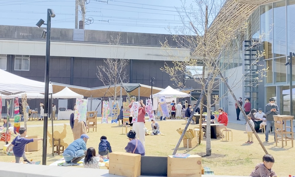 室内だけでなく、図書館前の駅前広場も、市民の憩いやイベントの場として活用されている。