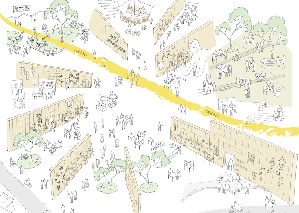 〈みるる〉のコンセプトスケッチ。黒磯駅から本棚のあいだを抜けるように、一本の道が通っている。(提供:UAo)