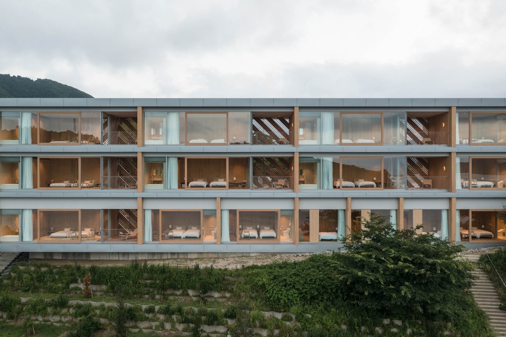 その思想を体現しているのが「薄さ」です。一般的な都市のラグジュアリーホテルは間口が狭く、奥行きが深い。すると土地利用効率は上がりますが、外部との距離はどうしても遠くなります。一方、線には長さはあっても奥行きはないですよね。そこで〈Entô〉は建物の奥行きをできるだけ浅くして、間口をたっぷりと広く取りました。この直線的な平面計画により、宿泊者が感じる自然の割合を最大化しています。