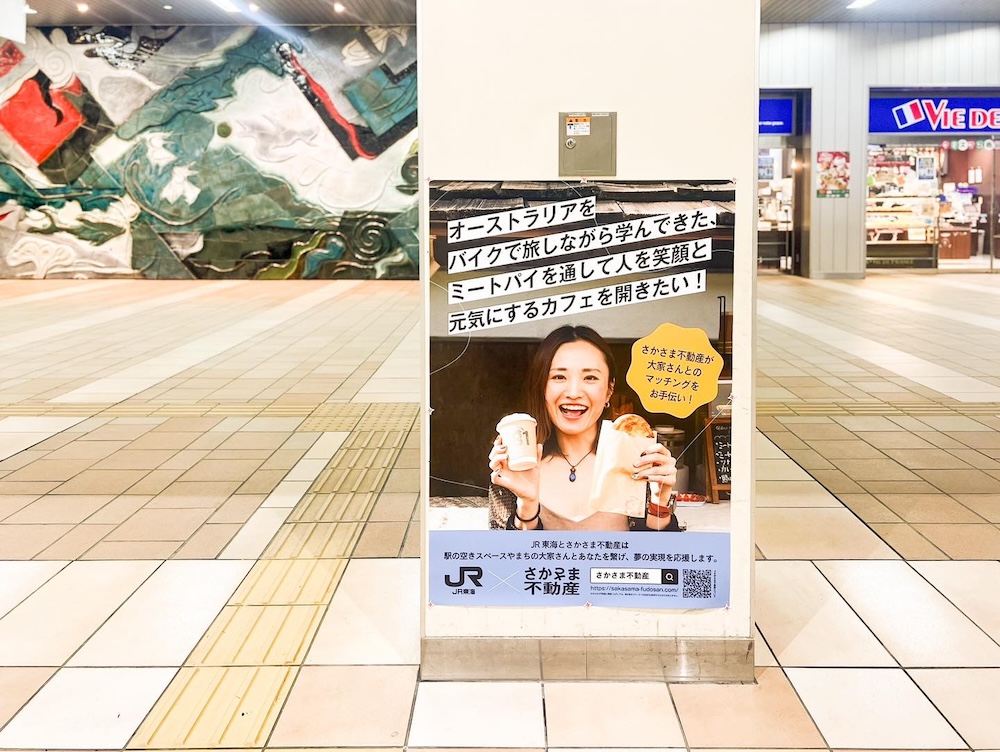 JR多治見駅構内に、〈さかさま不動産〉のポスター。直接JR東海に掛け合ったところ、連携が進んだ。「双方の課題感を解決する方法を模索したため、協力を得られやすいのだろう」と水谷さん。
