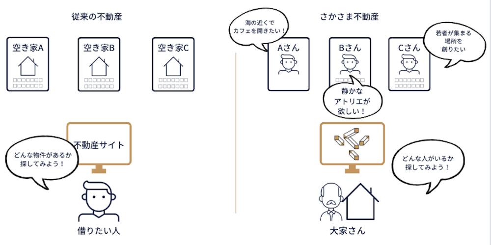 例えば「名古屋で本屋を開きたい」という人に対して、大家が「物件を面白く活用してくれそうだ」と思ったら手を挙げて、大家は物件情報を一般公開せずとも貸し手を見つけることができます。また、借り手も自分の挑戦を応援してくれているという安心感を得られます。