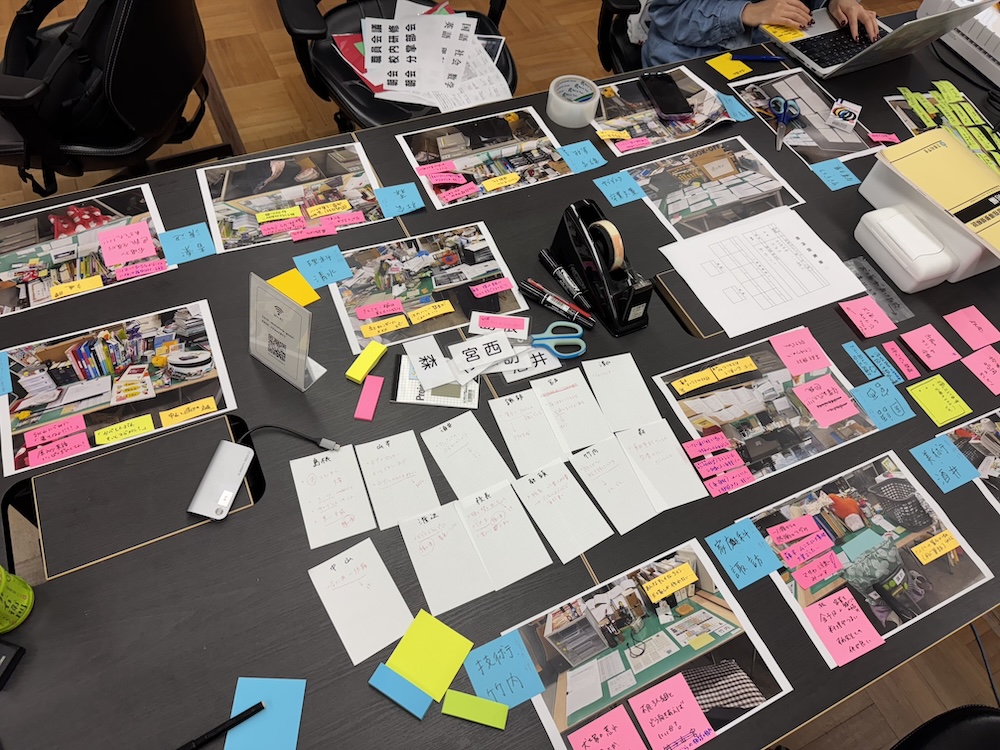 「あの職員室」の制作現場。先生の机の中にある(入れる)ものを整理しているところ。